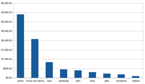 Tuition $3,395 Music & Dance $2,074 Misc $838 Textbooks $456 Tech $402 Food $305 Gifts $227 Donations $184 Clothes $95 Total $7,977