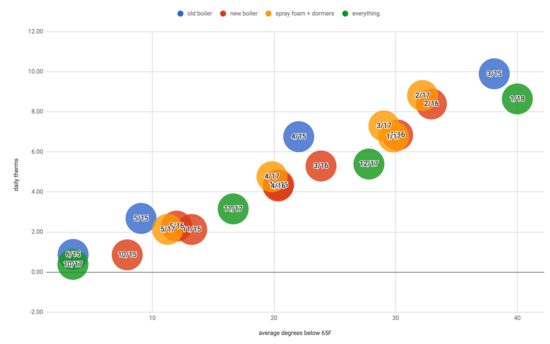 The change from adding dormers and accompanying spray foam is the opposite direction than I would expect, though it's noisy. Some of this could be the greater surface area of the house now that the dormers poke out of the roof. I also think we maybe started keeping the house warmer around this time, so it's misleading?