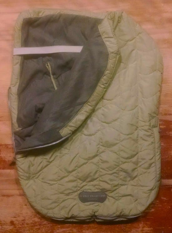 When I'm traveling with Lily, and I don't need to carry more than fits in my backpack, my favorite way to move her is just to hold her in my arms. It's cuddlier, she can be more mobile, and it's less hassle. As it's gotten into winter, though, she needs some amount of bundling up. She could wear a regular coat when we're out like this, but we spend a lot of time going in and out of buildings, buses, and subway cars, which involves large swings in temperature. I don't like leaving her bundled up for a long ride on the Red Line, but getting her in and out of a proper coat or snowsuit is annoying. I've been using something that's more of an insulated sack: