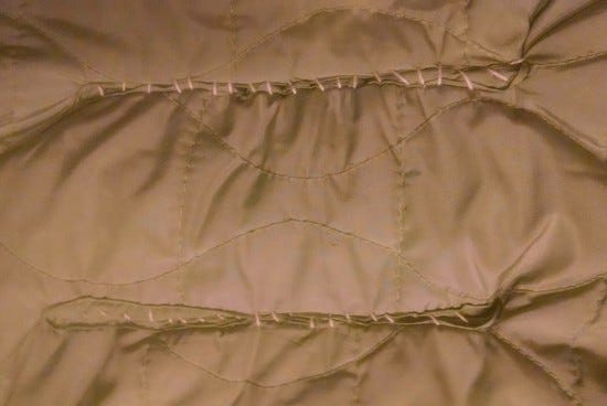 This was a hand-me-down that was designed as a stroller/carseat bunting bag, but it works well for this purpose. Except it has various holes in the bottom intended for carseat or stroller straps, and little feet can poke out and get cold. I sewed these up, in a way that would be easily reversable if we ever wanted to use the bag for its original purpose: