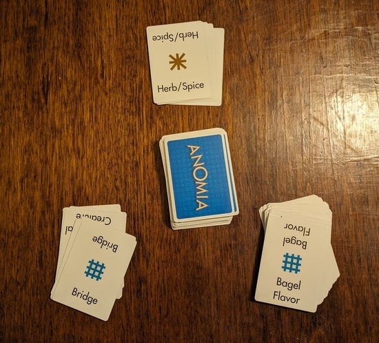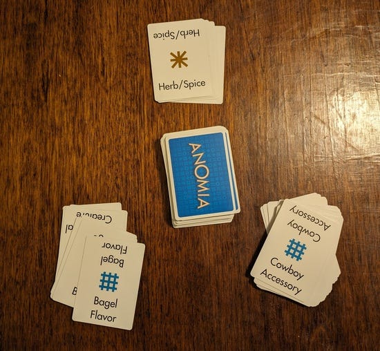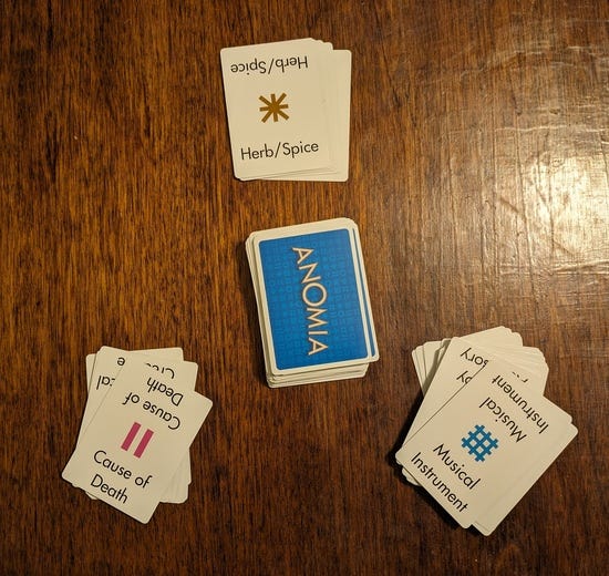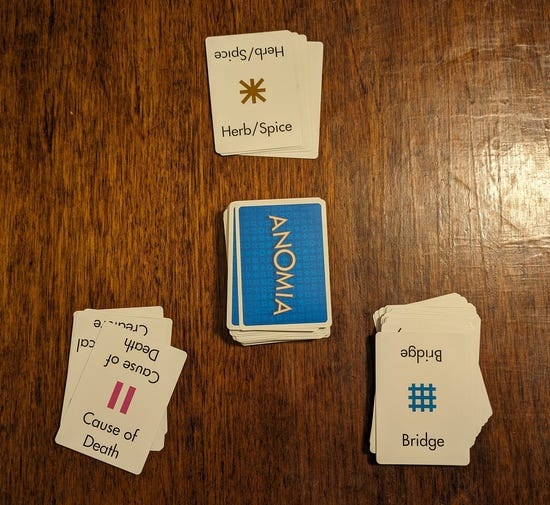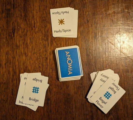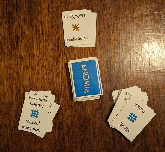 What makes this fun is you often end up with a stack of same-symbol cards on your pile, and so when someone takes your top card you're still displaying matching symbols. Then either they name something from your now-revealed card's category, or you name something for the card they just took and steal it back. You continue until you no longer match. I've played games where we ended up with a stack of 10+ matching cards, which several people tried to steal, some successfully and some not.