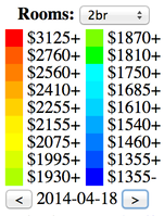 I also changed the way colors are assigned. Before I spaced colors at even intervals ($1000/bedroom, $1100/bedroom, $1200/bedroom, ...) but this also reflects a bad assumption about the distribution. Even spacing would make sense if we had an approximately uniform distribution of prices over a range, but instead it's much more like a bell curve:
