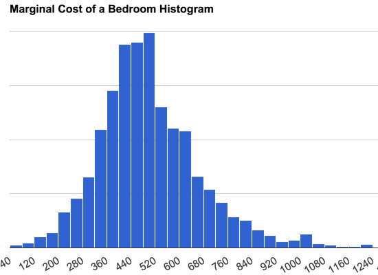 The initial model for my apartment price map was good enough for getting a sense of what different areas cost, but it was not an ideal fit for the underlying distribution. Specifically it assumed a linear relationship between number of bedrooms and cost (pretty reasonable) going through the origin (not reasonable). The problem is, a 2br doesn't cost twice as much as a 1br: