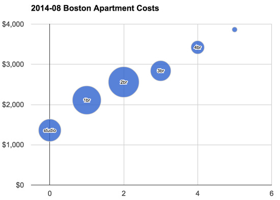 Yes, it's approximately linear, but the line doesn't go anywhere near the origin. Another way of saying this is that there's a price-preimum for having your own unit. This is the cost of a kitchen, bathroom, etc. I originally tried to handle this by eyeballing it and saying that we could count apartments as having a number of "rooms" equal to one more than the number of bedrooms, but this isn't right either. If we do a simple linear regression we see an intercept of $1,526 and a slope of $481/bedroom. The intercept is the cost of a studio or "0br" and the slope is how much each additional bedroom costs $481, on average, over the whole Boston area.