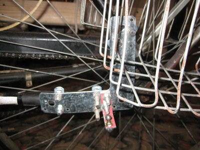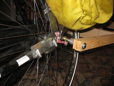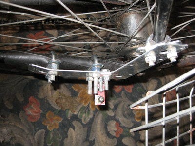 I made two different hitches, one for my bike and one for Julia's. For both the hitch itself is a QI250 quick dissconnect ball joint. I patterned the hitch after the bikes-at-work trailer hitch design. On Julia's bike I used U-bolts to attach it to the frame: