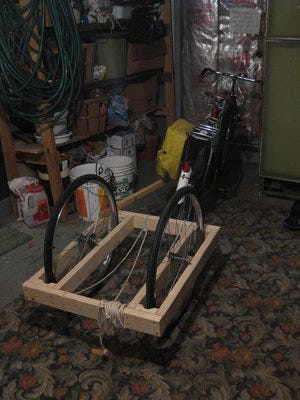 The rope is to suspend milk crates so they are below the level of the axles and give a nice low center of gravity. I'm considering using bungee cords instead for some suspension, but I need to think about how to be sure they won't stretch enough to touch the ground. I still need to paint the frame and add brackets to attach bungee cords to for holding the load.