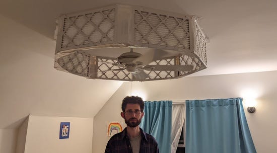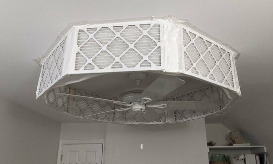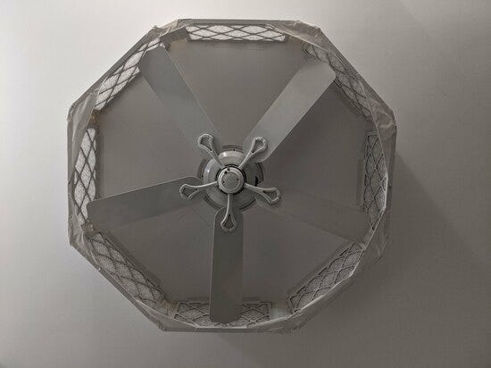 In terms of cost, materials for one fan are nine MERV-14 filters for $110 plus ~$5 for tape. The ceiling fan was a Hunter Mariner 52", which seems to cost $106 now, though it's not something I installed for this project. A real-product version of this would replace the tape with a frame you attach to the ceiling, into which you could slide filters. Maybe $100? If someone wanted to build and sell something I'd be pretty happy to see that!