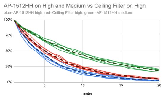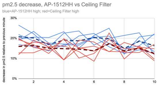 I think it ought to be possible to get even better performance out of the ceiling purifier by building a shroud. The ideal shroud is generally quite a bit narrower than I would guess: I've seen people measuring peak performance with only a 14" hole for a 20" fan. They report ~40% more airflow without increased noise, but I would want to run tests and verify that here.