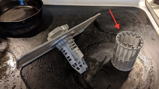 It all still mostly worked, but only if we scraped our dishes well and if I spent a frustratingly large fraction of my time picking at the sprayer arms with a bent paperclip. Still less work than handwashing, though not by much. I read the manual, forums, etc; couldn't figure it out. Eventually we called the manufacturer and they sent someone out. They pulled the filter, and saw that the macro filter (left) was present but the micro filter (right) just wasn't there.