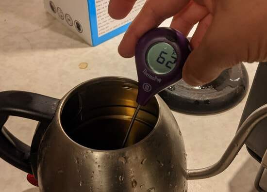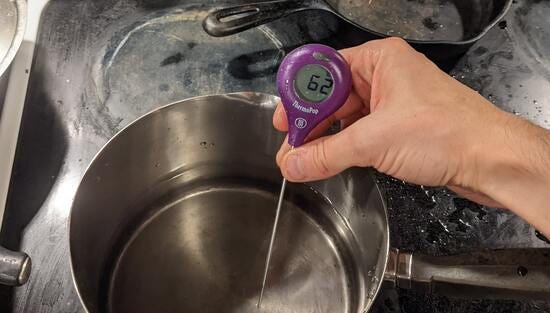 I filled them both with a quart (about a liter) of water, which was near the capacity of the kettle, and verified that both were starting at the same temperature (62F):