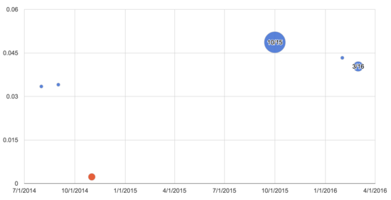 I wanted to make sure that Groove wasn't an error here, so I looked at the details for those plays. Here's plays over time, with time on the x-axis, payment per play on the y-axis, and the size of the bubble indicating the number of plays: