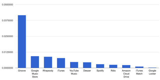 Channel #streams per-stream payment Spotify 7458 $0.00298665 Google Locker 214 $0.00029294 Rdio 195 $0.00259000 iTunes 167 $0.00781138 Google Music Store 155 $0.00931066 Amazon Cloud Drive 142 $0.00227943 iTunes Match 104 $0.00117343 YouTube Music 52 $0.00477044 Deezer 29 $0.00452452 Groove 22 $0.04171718 Rhapsody 19 $0.00890842 iTunes Radio 4 $0.00099782 Tidal 2 $0.01382660 Omnifone 1 $0.01879669