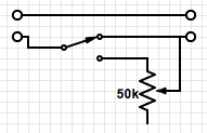 Wait, didn't I say it was a "boost" pedal? That looks like it sometimes leaves the signal alone and sometimes runs it through some fraction of a 50k resistor which would reduce the voltage and make it quieter. Luckily it doesn't matter: the output volume from the keyboard is high enough that we can have the resistor usually present, making the keyboard quiet, and then switch it out when we want the keyboard to be louder. This has the effect of a "solo boost pedal" while being an electrically much simpler "rest-of-the-time cut pedal".