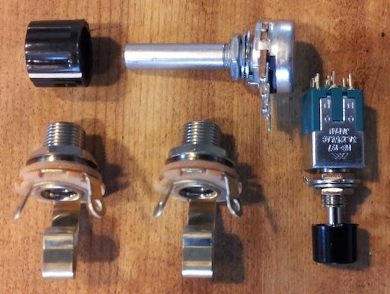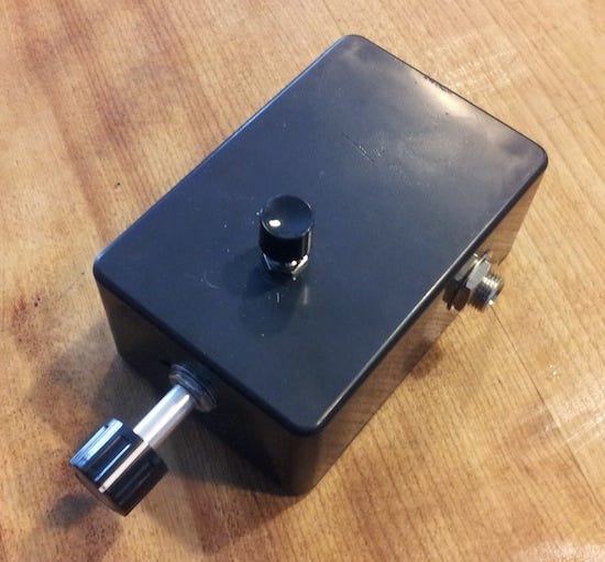 Most such switches out there are designed for guitars, which produce a very different type of signal than keyboards, despite using the same 1/4" connector. A guitar pedal would work, but would need electricity and be overly complicated. For the output of a keyboard we just need a variable resistor that we can switch in or out of the signal path: