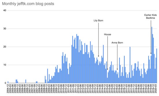 Then we had a second kid, and while the house situation became less work kids started taking more time. This wasn't really a problem: I like spending time with the kids, and I also like working on the house. But it meant I had less slack and often had things I would like to write about (or other things I would like to do) that I didn't have time for. Spikes in the graph correspond to things like vacations, work travel, and unemployment.