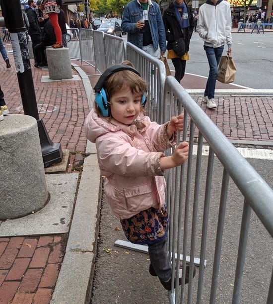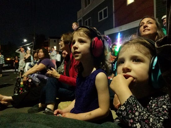 Last summer, with the Fourth of July coming up, I ordered ear protection for the kids. I think I got this blue pair and this red pair. They were very effective! In 2018 both kids wanted to go home as soon as the fireworks started, while in 2019 they could enjoy watching them for a while: