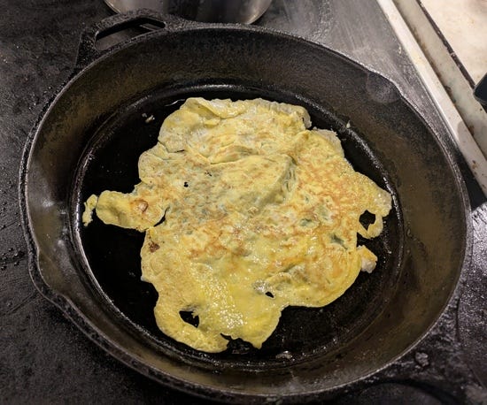 I had been making crepes for Anna and lactovegetarian crepes (milk, flour, flax) for Lily. I would ask Nora what she wanted, and she preferred Anna-style. "Eggy eggy eggy!" I started asking if she would like them more eggy, and she was very enthusiastic. Over time I reduced the non-egg ingredients until it was entirely egg, and she continued to be a fan. It initially surprising to me that Nora wanted to go all the way in this direction, but since sweet omelettes are a thing it probably shouldn't have been.