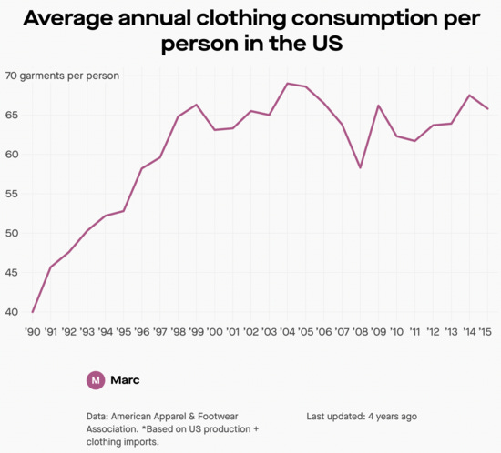 On the other hand, possibly this statistic began as a global number? That would be a lot more plausible, but also makes it much less relevant to discussions around the sustainability of fast fashion. Instead of being driven by Americans or other rich consumers becoming more wasteful, it would be driven by global decreases in poverty. Which is a very good thing!
