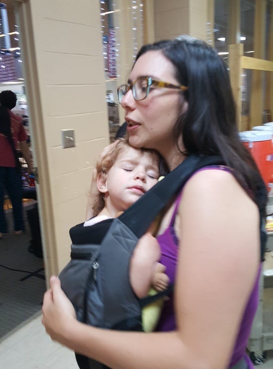 Naps are also important: I try to keep as close as possible to our normal napping schedule as I can, though shifting it forward to keep it in the same place relative to when she's waking up and going to bed. This was flexible enough that I could usually fit a nap in around my playing responsibilities, though a few times Dereck/Claire supervised a nap and once we tried a nap in a carrier during a workshop:
