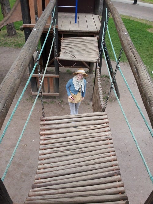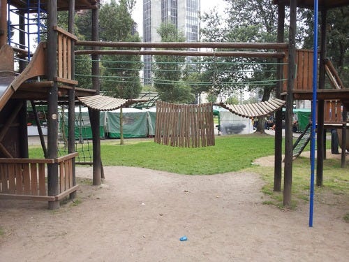 In another part of the park there was a playground. It was mostly quite nice and in good repair, but there was a bridge that was broken and pretty dangerous looking: