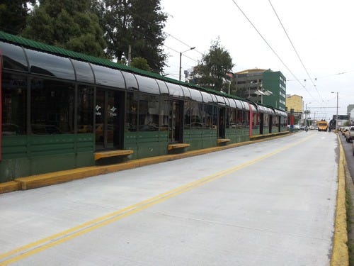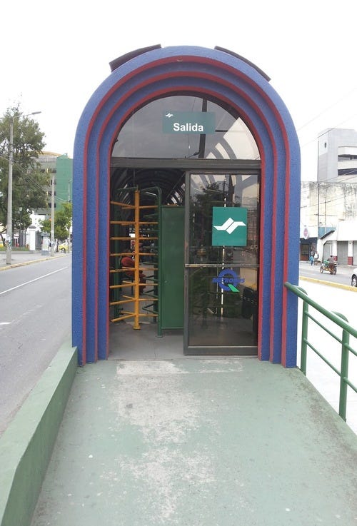 We walked around the city some today, getting a feel for the place. They have a Bus Rapid Transit system called 'El Trole' which is a trackless trolly that runs in it's own separate lane with elevated platforms. Each station is laid out like: