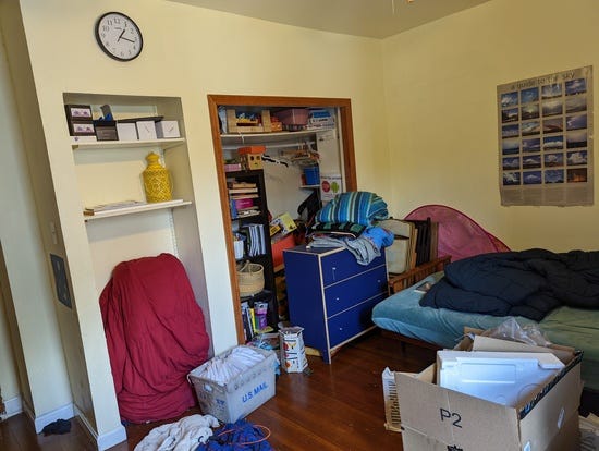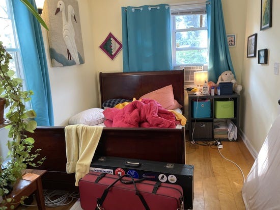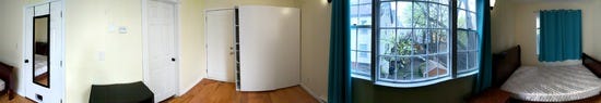 The near bedroom could also be rented out. It has one window, and it tends to be noisier because it's near the main living space. In winter this room is warmer. This room is available now.