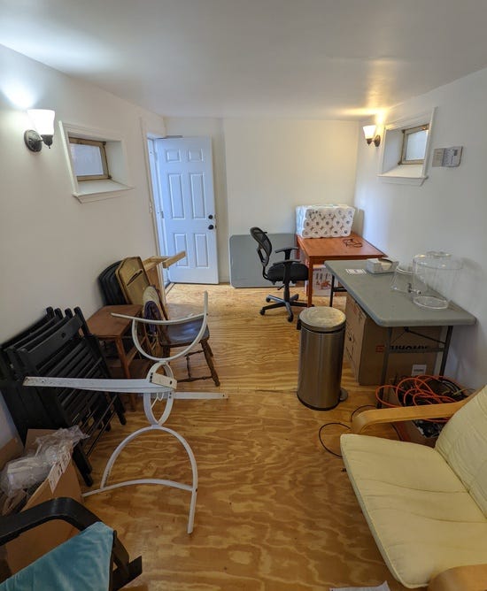 The office is a 9x15 finished stand-alone building in back of the house. It has heat, electricity, and is well insulated, but doesn't have plumbing and can't be used as a bedroom. It's the most quiet of the three, and is available now.