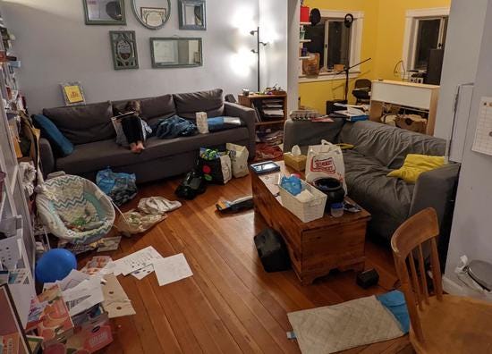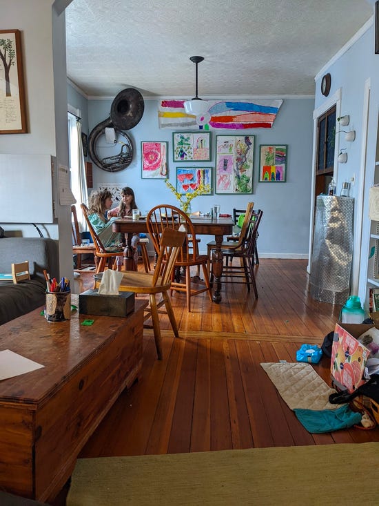 The kids make a bit of a mess of the living and dining room over the course of the day, and I tidy before going to bed. We are hoping to transition to them cleaning up after themselves as they go, but you shouldn't count on that! Just before tidying it might look like: