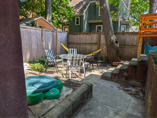 The back bedroom has three windows looking over the backyard and neighbors' yards. There is not much traffic noise but significant birdsong in the morning. There's a door to the fire escape which goes to the backyard. It tends to be pretty quiet because it's farthest from the living space. In winter this room is colder. This room is available for October, or possibly September.