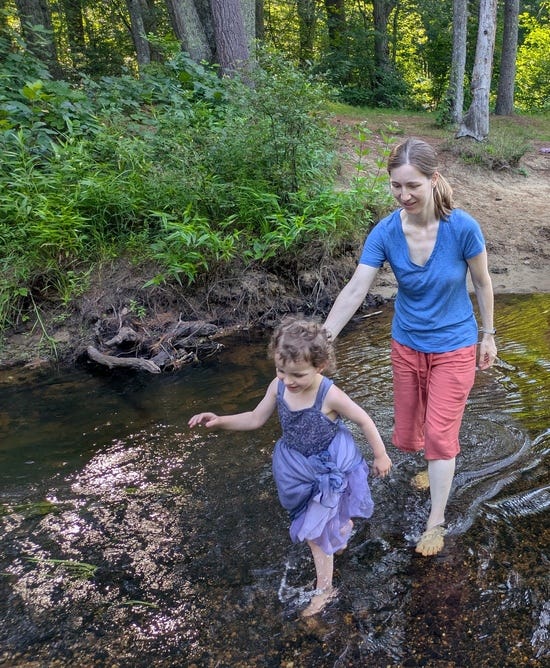 I've been thinking about wading safety for Jo. We've done baby/toddler swim lessons, but the curriculum is mostly focussed on true swimming, which she won't be able to do for years. I wish they focussed more on wading skills, since getting good at that is more realistic and more relevant to situations toddlers are likely to be in, and I've used some of our relatively unstructured swim lesson time to hang around on the ramp into the pool where Jo can walk around. I'm very happy when she stumbles, gets her head under the water, and recovers without me touching her (this has happened twice, both times she was a bit shaken afterwards but fine). I've considered, but not actually tried, knocking her over on purpose and making her practice. Maybe this will encourage me to do that.