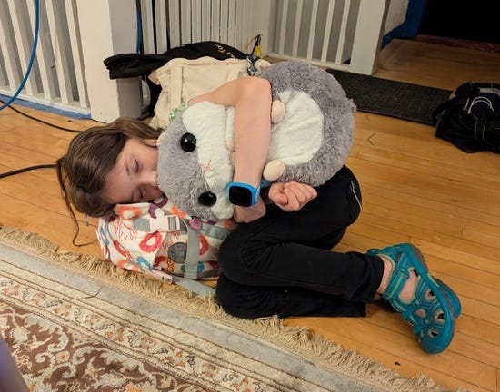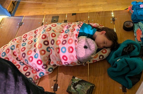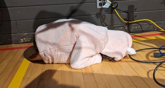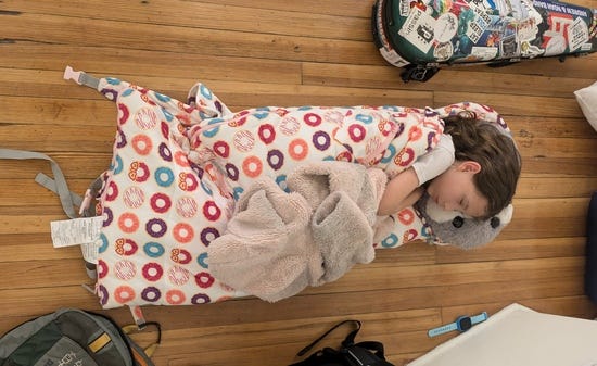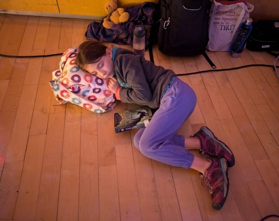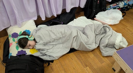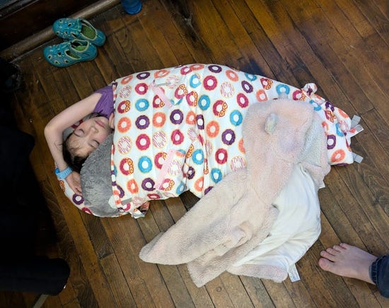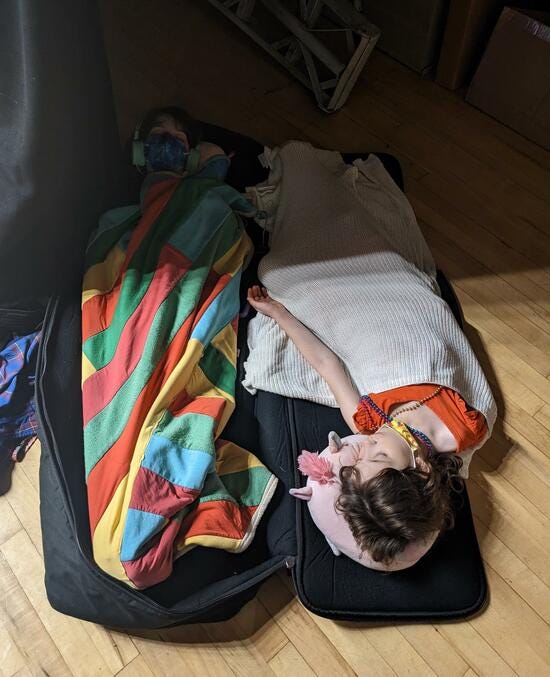 When I think of the ideal place for sleeping it's something like, peaceful, dark, and quiet. The chaotic bright loud stage of a contra dance is pretty far from this, and yet generations of kids have curled up behind their parents and fallen asleep: