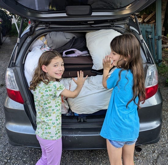 Pictured: much more bedding than required for this purpose, because this is the car packed for vacation. I don't have a good picture of the car packed for playing dances.
