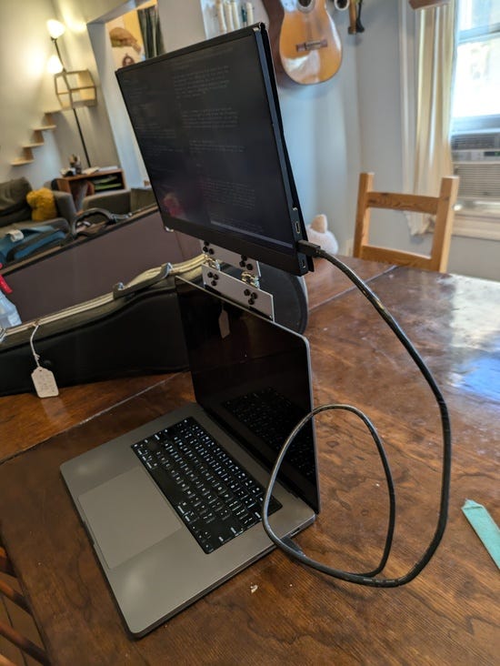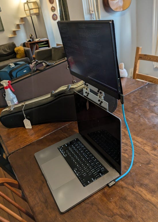In the spirit of coming back to things once I have more experience with them, I've continued to be very happy with my stacked laptop monitor. I just got back from a week of touring and then vacation with Julia's family, and I used it almost every day. Being able to use my laptop comfortably nearly anywhere is pretty great.