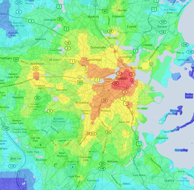 After looking at the maps from yesterday showing how long it would take on transit to reach various places given a starting place, I thought it would be nice to make another map that shows the "transit service quality" in an area. Roughly, this would mean "how long does it take me to get places on transit starting from here?" A smart map would know that some places are more desirable as destinations (more people want to go to copley square than west medford square), but I'm treating all points on the map as equally valuable. So on these maps, each point represents the average time it would take to get to anywhere else on the map, calculated using tillberg's maps.